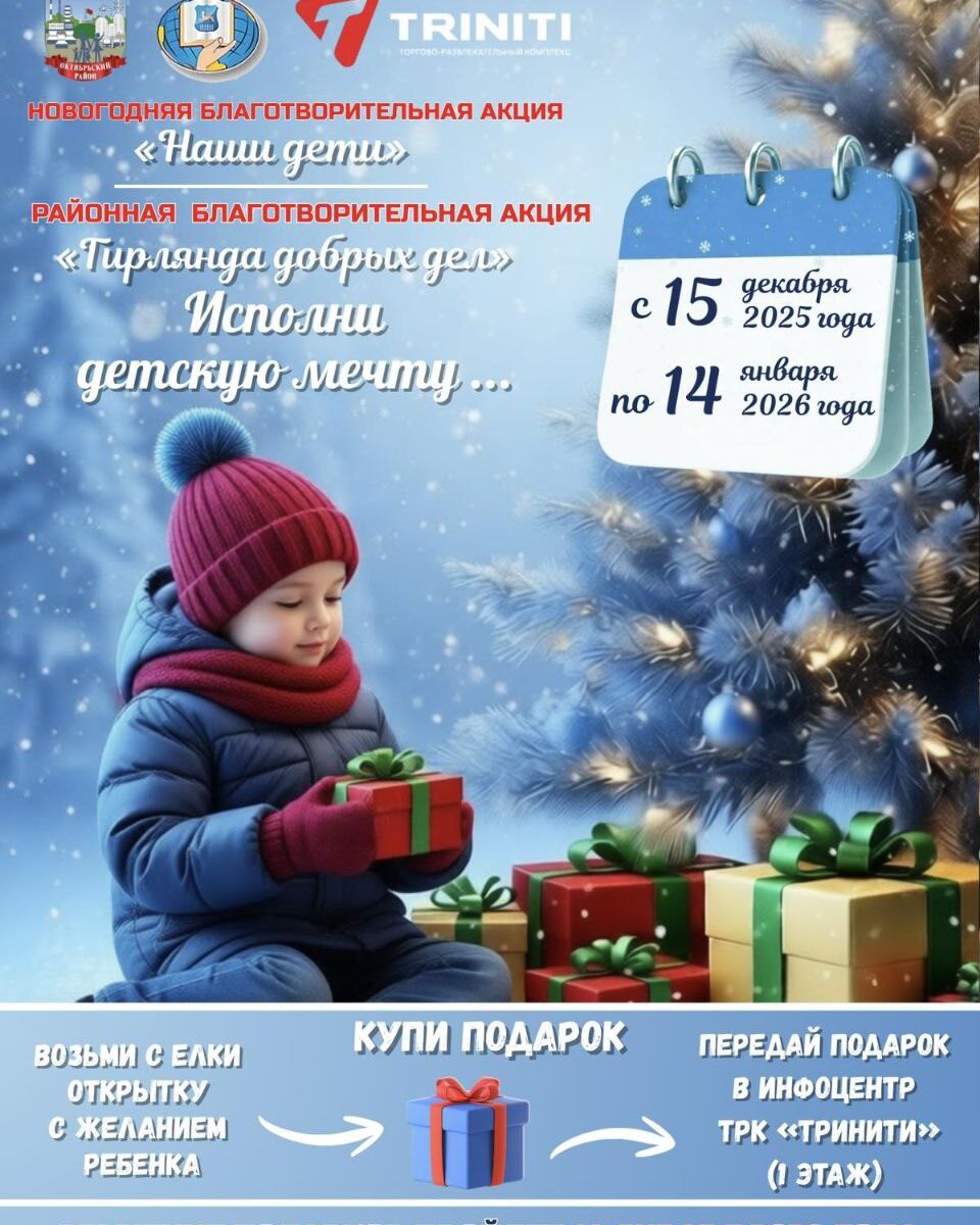 Исполнить детскую мечту может любой желающий. Для этого следует найти елку с открытками в ТРК “Triniti”, выбрать открытку с желанием, купить подарок, передать его в инфоцентр на 1 этаже.