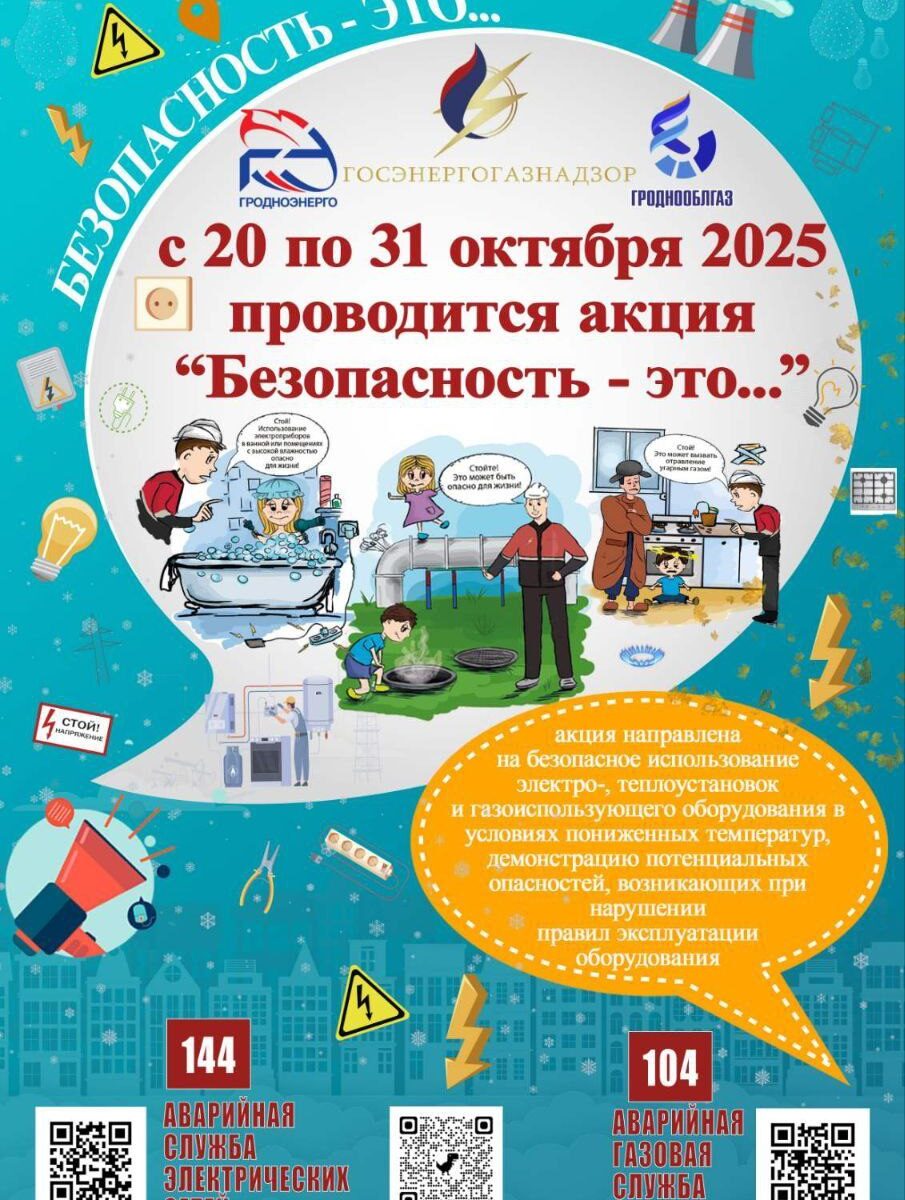 ГУ “Государственный энергетический и газовый надзор” совместно с “Белэнерго” и ГПО “Белтопгаз” в период с 20 по 31 октября проведет акцию, направленную на безопасное использование электро-, теплоустановок и газоиспользующего оборудования в осенне-зимний период, “Безопасность – это…”. Об этом сообщили БЕЛТА в Госэнергогазнадзоре.