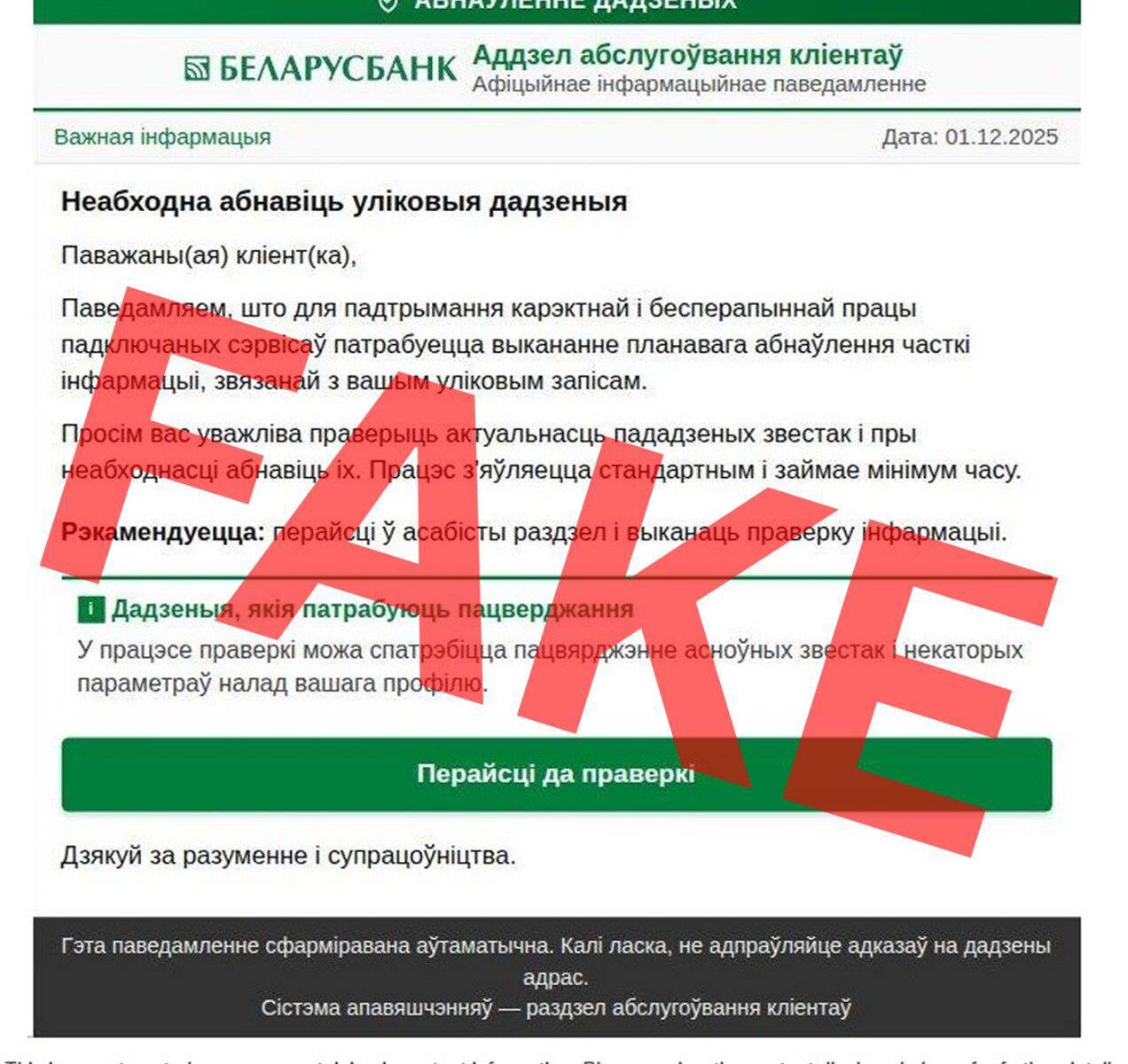 Мошенники от имени Беларусбанка проводят фишинговую рассылку.