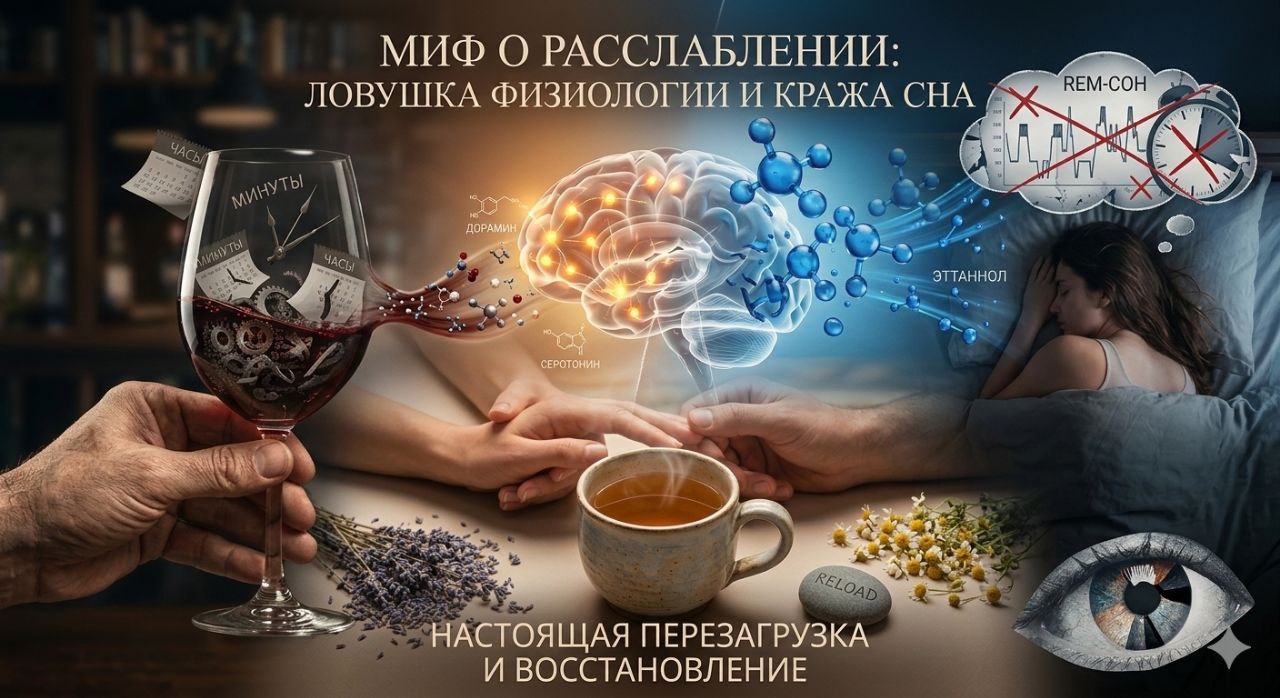 Вечер. Тяжелый день позади, за спиной — десятки решенных задач, а в голове — гул от бесконечных уведомлений. Кажется, что бокал вина — это самый быстрый и заслуженный способ нажать кнопку «Выкл». Знакомое чувство? Мы привыкли называть это «расслаблением». Но если заглянуть в учебник физиологии, картина меняется. Алкоголь не дарит…