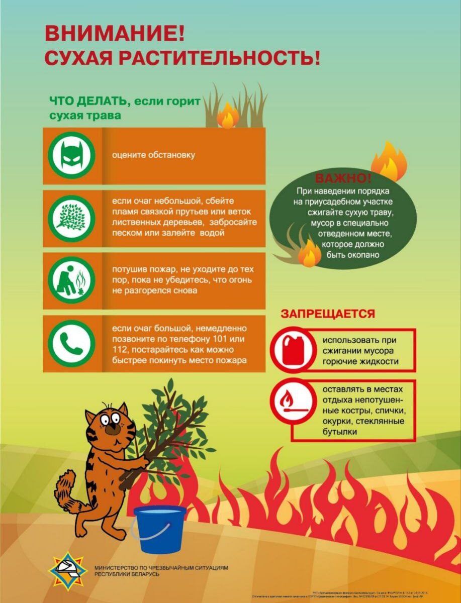 С приходом солнечной погоды владельцы участков начали наводить порядки и сжигать прошлогоднюю траву, листву и ветки. Только за выходные спасатели Гродненщины 28 раз выезжали на загорания сухой растительности, а с начала года – 73. Выжигание сухой травы на корню строго запрещено!!! (*административная ответственность и штраф до *30* *базовых величин**) Сжигайте…