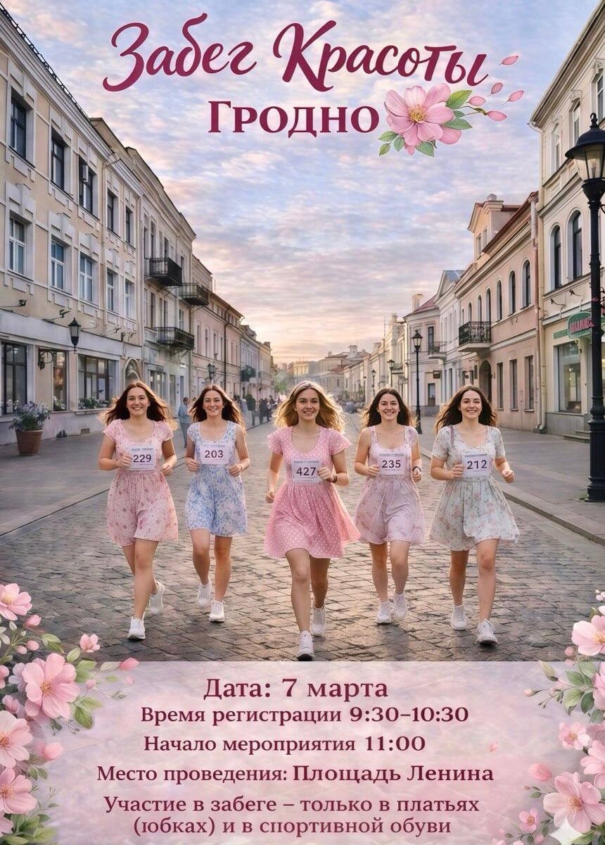 Как сообщает телеканал «Гродно Плюс», стартует забег 7 марта в 11:00 с площади Тизенгауза. После чего участницы направятся по улице Дзержинского, затем по Ожешко и Советской. У здания Гродненского областного объединения профсоюзов — разворот, а дальше курс на финиш — площадь Ленина. Маршрут красивый, компания – уже больше 200 человек….