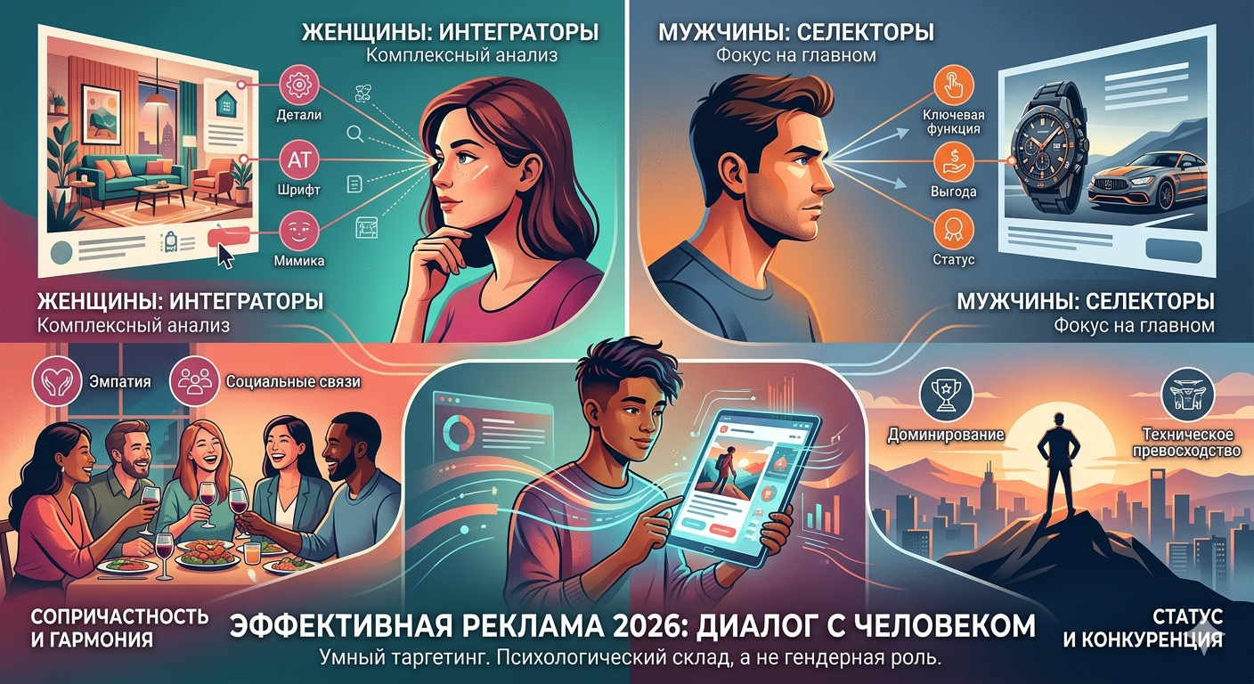 Женщины (Интеграторы): Склонны к комплексному анализу. Они замечают детали (шрифт, мимику, фон) и оценивают продукт через контекст. Им важно, как вещь впишется в их жизнь.