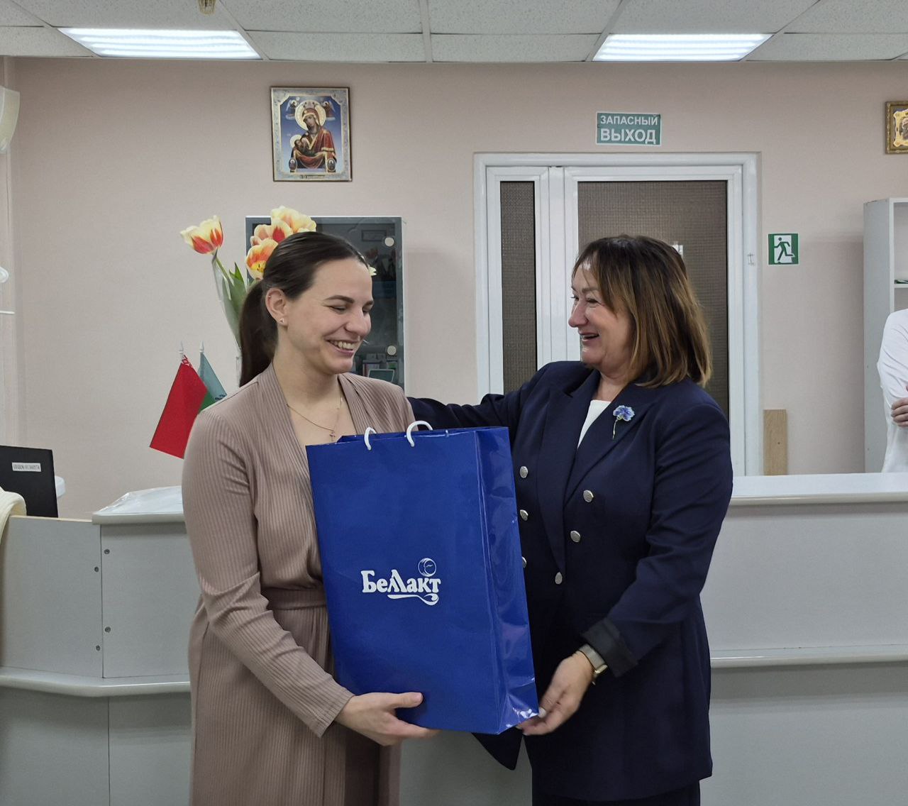 С миссией добра и признательности палаты больницы посетила председатель Октябрьской районной организации ОО «БСЖ» Светлана Степановна Купрашевич. Вместе с подарками она подарила молодым мамам частичку весеннего тепла, пожелав им сил и благополучия в новом статусе .